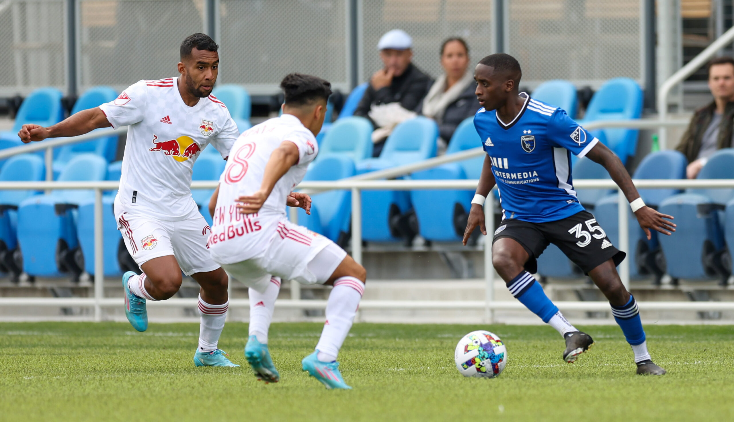 San Jose Earthquakes Midfielder JAMIRO MONTEIRO (35) looks for space between New York Red Bulls Midfielder FRANKIE AMAYA (8) and New York Red Bulls Forward CRISTIAN CÁSSERES JR (23) during the MLS match between the San Jose Earthquakes and New York Red Bulls at PayPal Park in San Jose, California