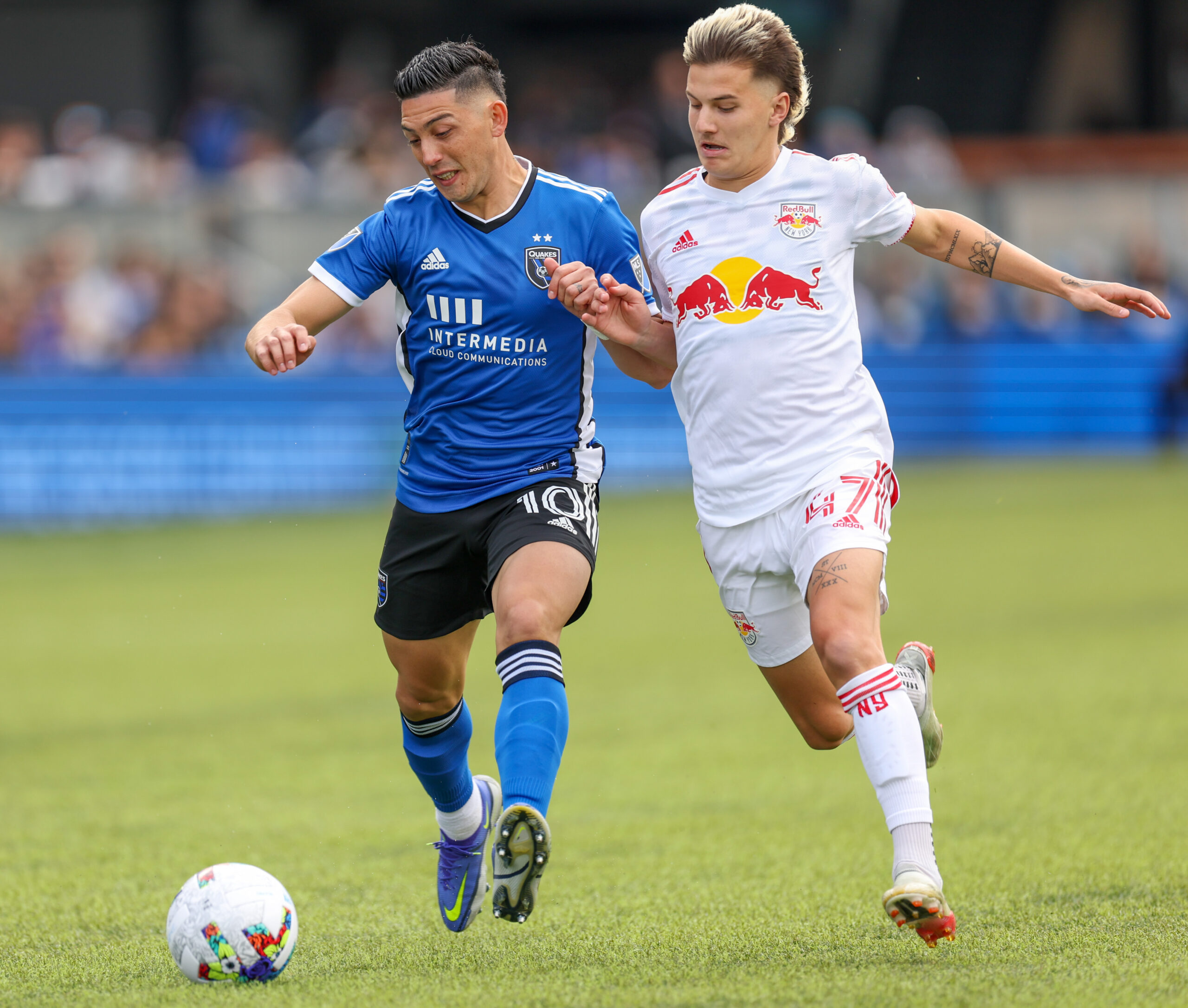 San Jose Earthquakes Midfielder CRISTIAN ESPINOZA (10) and New York Red Bulls Defender JOHN TOLKIN (47) challenge for the ball during the MLS match between the San Jose Earthquakes and New York Red Bulls at PayPal Park in San Jose, California