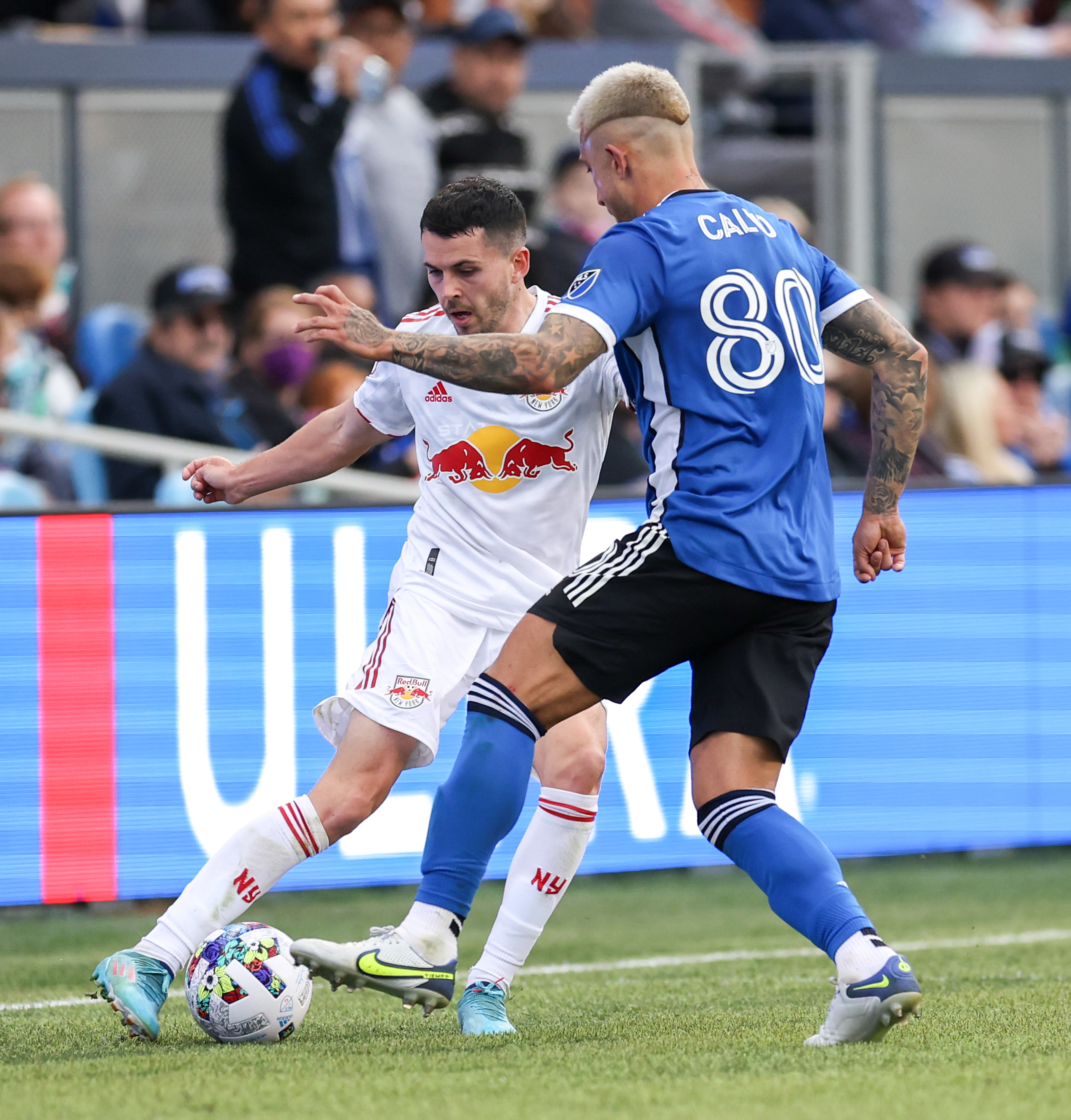 New York Red Bulls Midfielder LEWIS MORGAN (10) tries to escape the pressure from San Jose Earthquakes Defender FRANCISCO CALVO (80) during the MLS match between the San Jose Earthquakes and New York Red Bulls at PayPal Park in San Jose, California