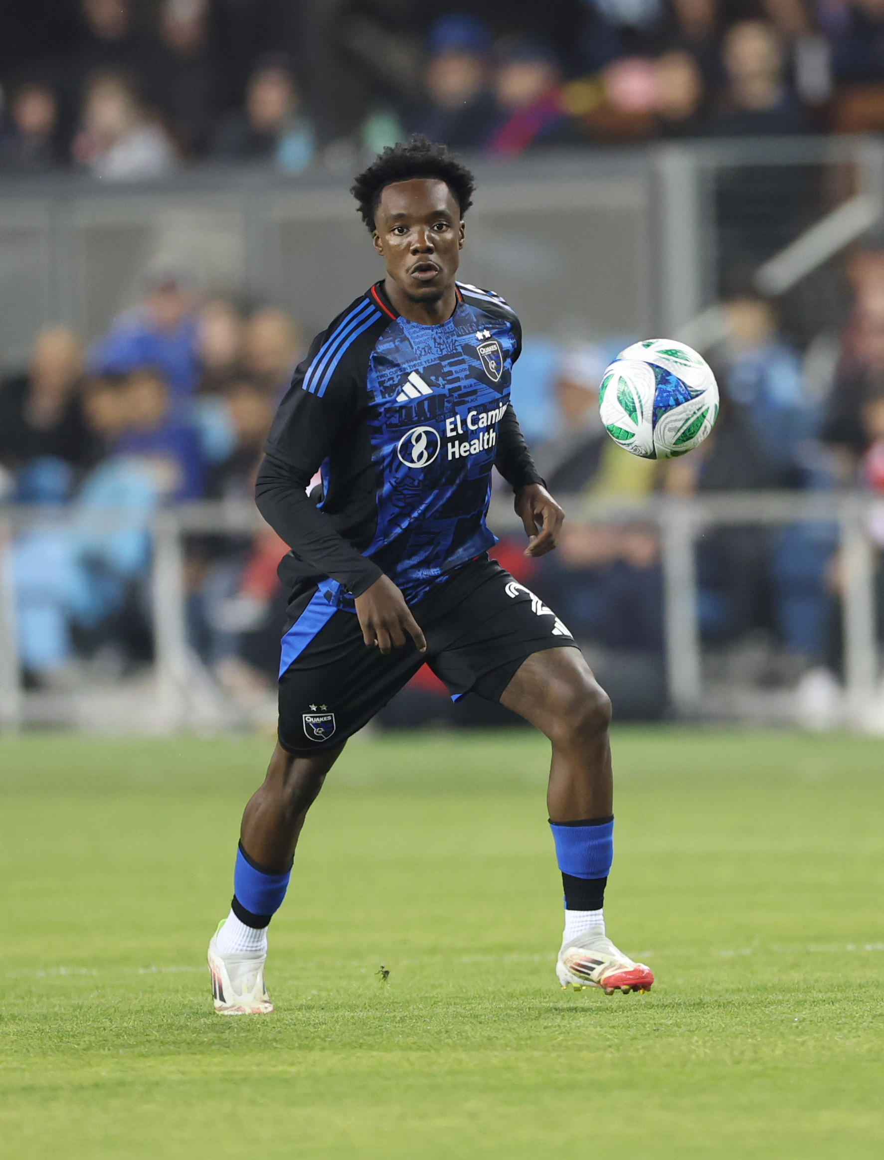 San Jose Earthquakes Defender JAMAR RICKETTS (2) looks upfield for a teammate during the MLS match between the San Jose Earthquakes and Real Salt Lake at PayPal Park in San Jose, California