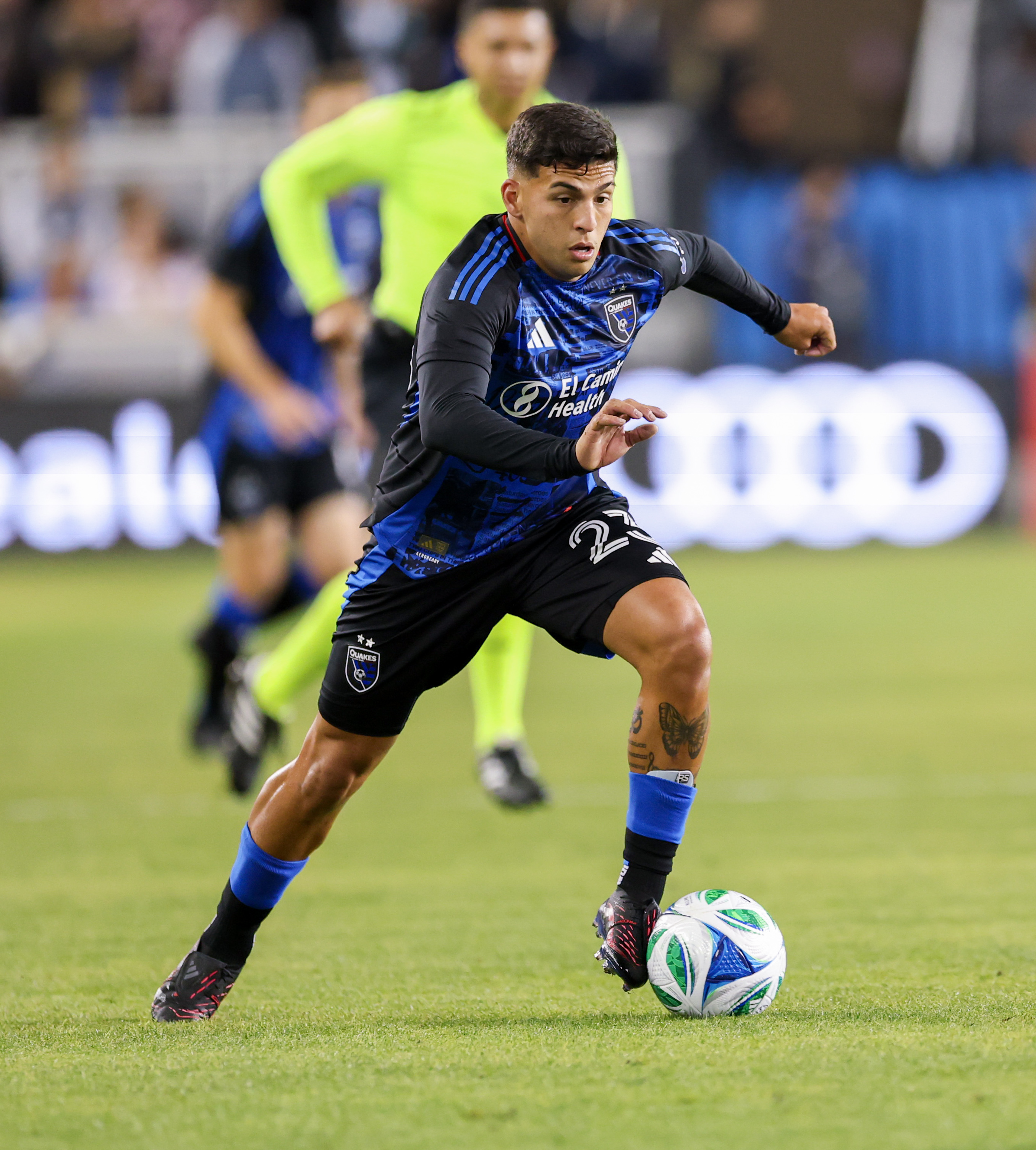 San Jose Earthquakes Midfielder HERNÁN LÓPEZ (23) drives the ball upfield during the MLS match between the San Jose Earthquakes and Real Salt Lake at PayPal Park in San Jose, California